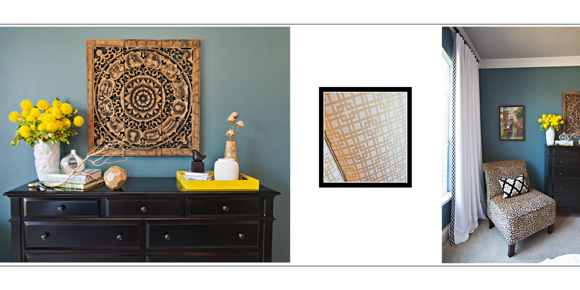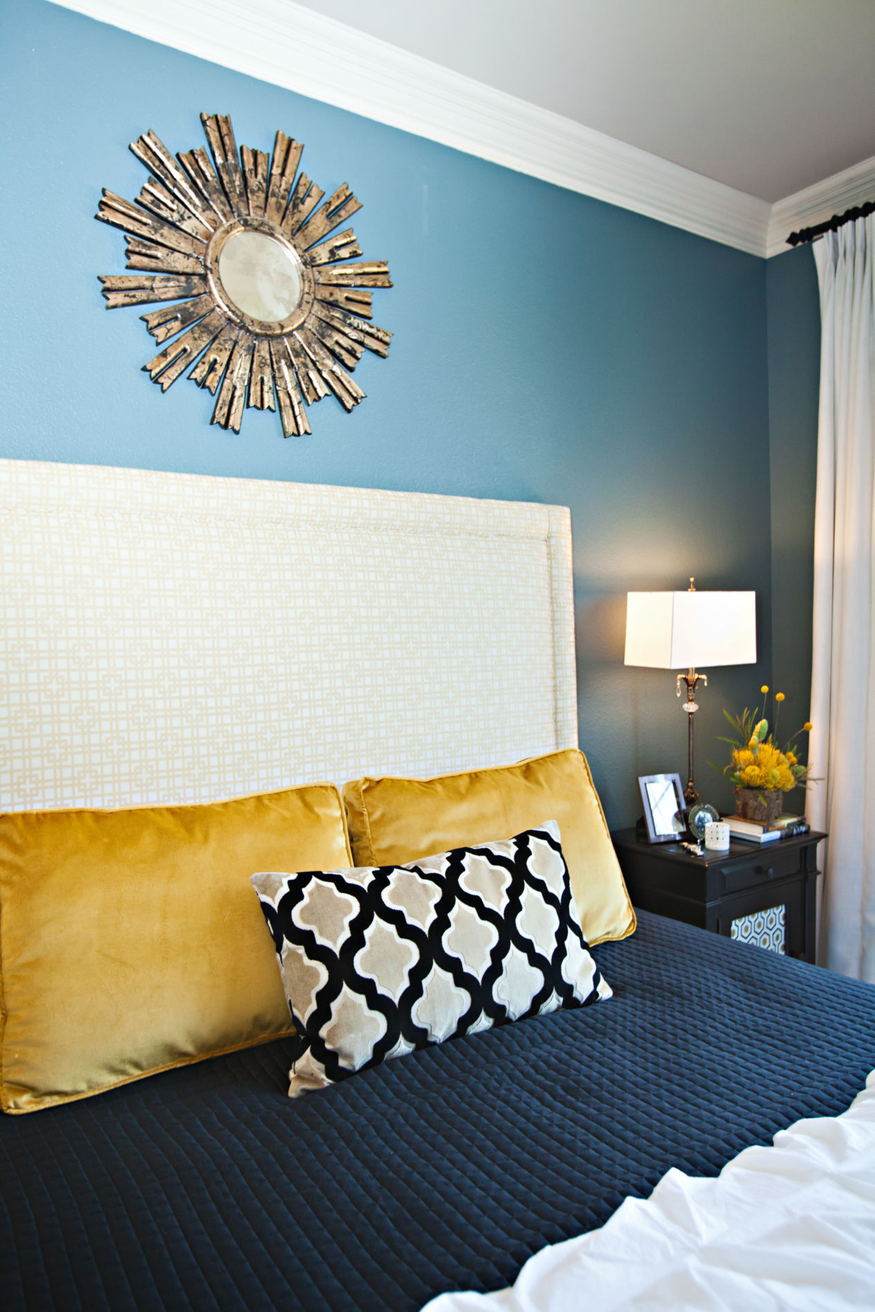 I was SUPER excited when Cottages & Bungalows wanted to feature this master bedroom last fall! I loved the custom yellow and ivory graphic patterned headboard that we had made using fabric from Kravet. The warm yellow touches really did help to create a sophisticated yet chic master for my clients!