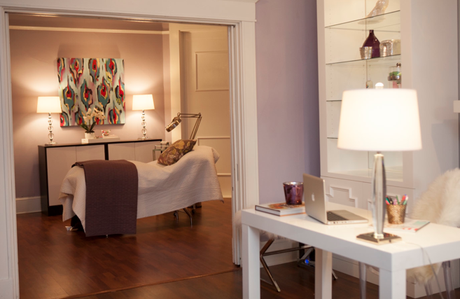 We recently installed this custom sized canvas Peacock Print in Blue from Laura Dro over a console table. The space is primarily lavender but we wanted to mix it up a bit with fuchsia and a few bright pops like yellow and a bit of green.  Now we are able to bring in a few accent colors throughout the space and of course create the wow factor for everyone that steps into the space.