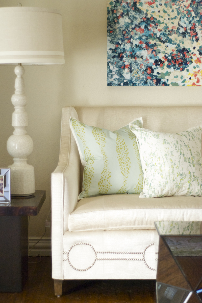 For the Spring and Summer months, I thought it would be nice to bring in something a bit more feminine.  I toned down the pillows   with a few of my favorites, Wavy Ikat and Baubles Green from Megan Adams and selected something bold in color for the art.  This original canvas painting (Confetti), also from Megan Adams was perfect. I love the bits of yellow, teal and deep fuchsia.