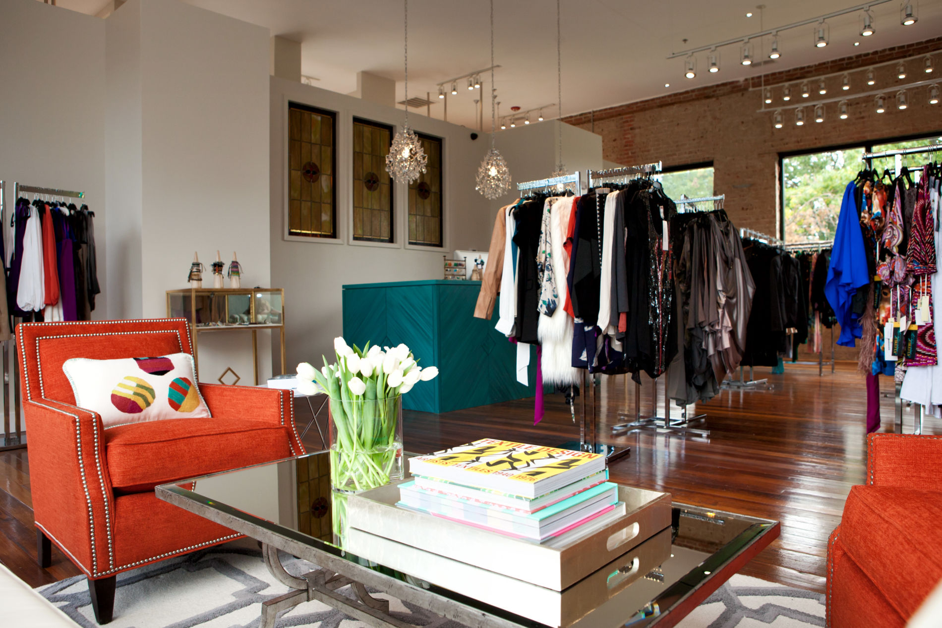 BEFORE: This view of the gorgeous stained glass windows suspended in wall screamed “main check out area”. It was going to become one of our favorite focal points in the space and would be instantly seen as soon as you walked into the boutique.