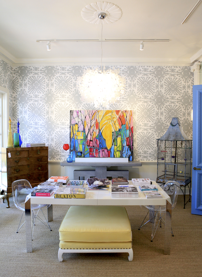 This room is so fun, it makes me a little giddy. I love how they combined the yellow chair with the yellow chandelier. Your eye almost struggles to decide which piece it wants to look at. This also draws attention to the cool wall art. And the little yellow accent on the zebra print chairs is like cherry on top.