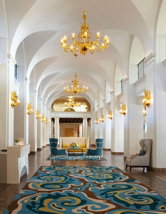 Talk about “wow factor”. These Murano glass lighting fixtures definitely add some opulence, while the yellow cushions make the entire space feel a little more casual and approachable. And look how it pops in this room full of blue. Gorgeous!