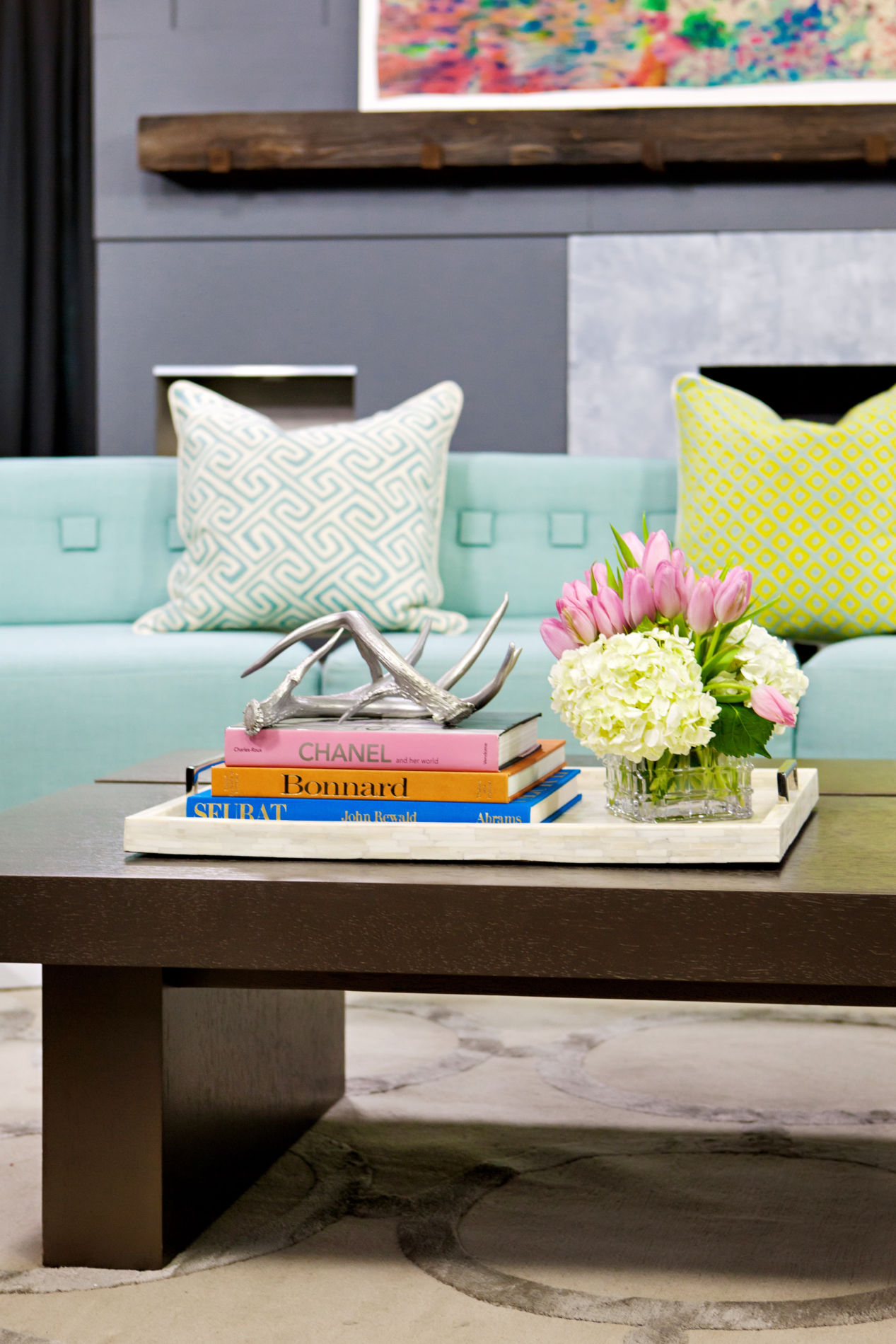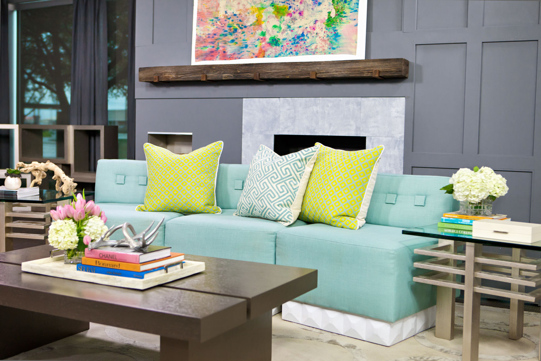 We used the Coco rectangular coffee table in Mink, two of the Chocolate end tables in Champagne and the Carmelo Console table in Mink on The DTV set. We love the pieces so much that we went back for the Cafe Sofa in a white lacquer to use in the opening for D The Broadcast!