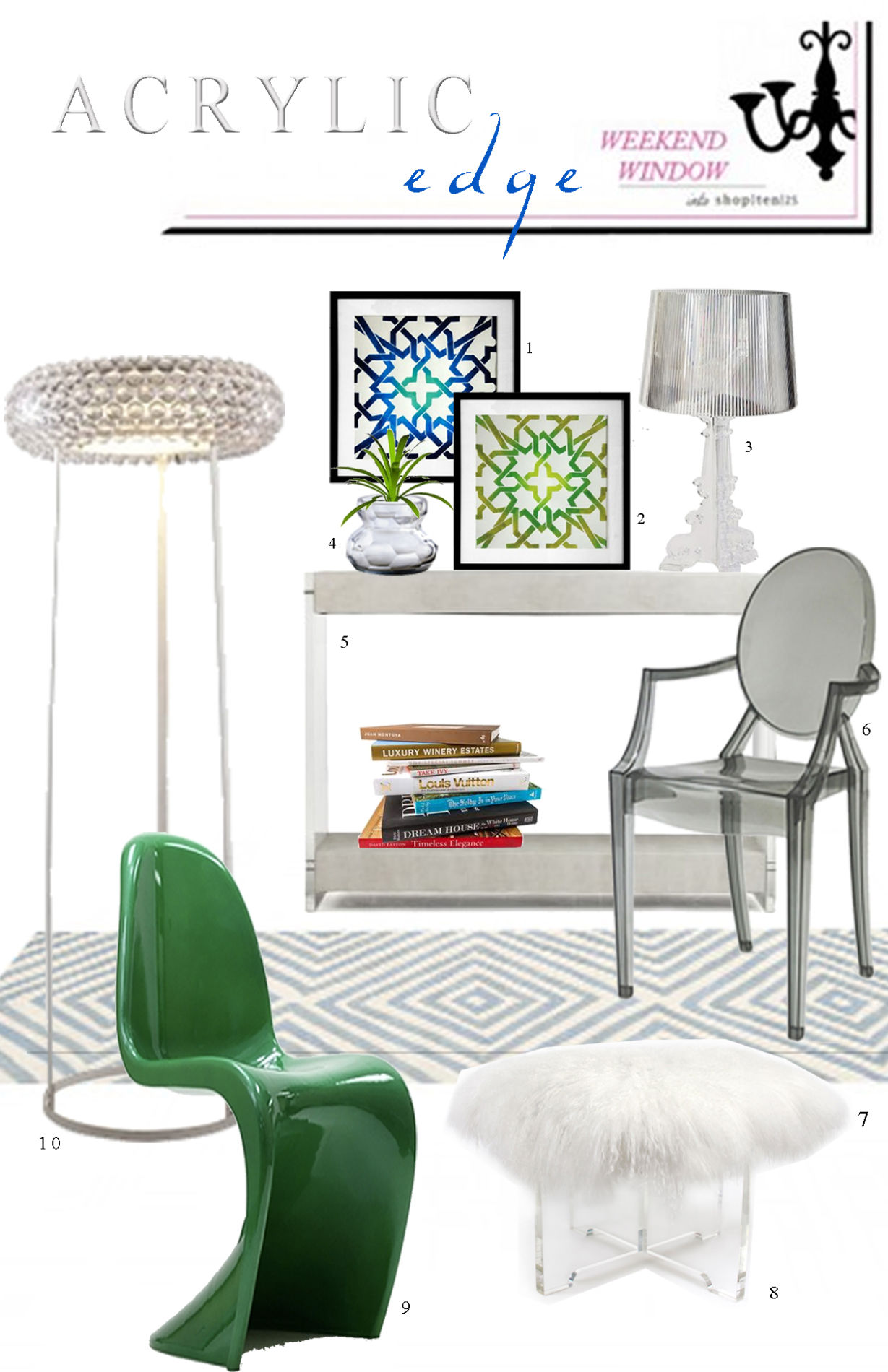 1. Cordoba Blue Print 2. Cordoba Green Print 3. Clear French Acrylic Lamp 4. Acrylic Faceted Vase 5. Acrylic & Ivory Console 6. Ghost Chair in smoke gray 7. Blue Diamond Rug 8. Mongolian Lamp Ottoman 9. Green Slither Chair 10. Halo Acrylic Floor Lamp